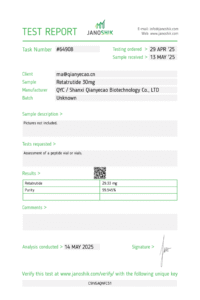 Each lot is sourced through our verified global supply chain with emphasis on traceability and quality control. We work diligently to obtain and maintain third-party analytical reports (HPLC/LC-MS) and Certificates of Analysis for each batch, as part of our ongoing quality process. These documents are reviewed internally and displayed as they become available. Independent third-party testing is also performed on select lots to confirm identity, purity, and alignment with our internal specifications.