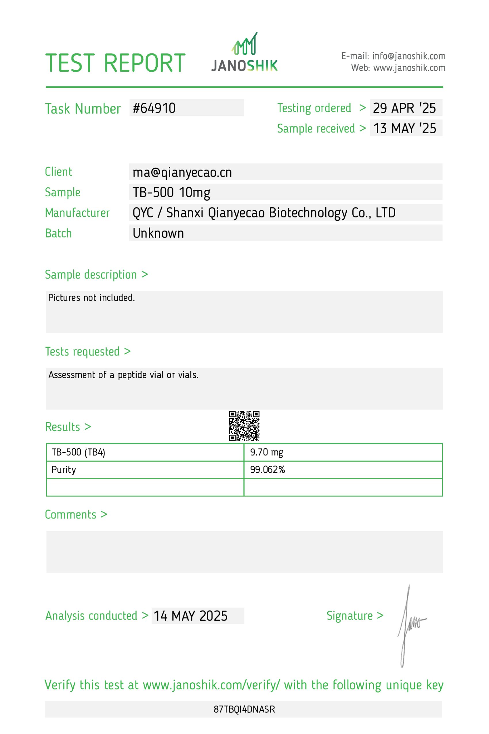 We require a verified purity of 99% or higher and perform independent third-party spot testing to confirm that select lots meet our internal standards for identity, purity, and composition. Where available, endotoxin testing results are included on Certificates of Analysis to verify laboratory purity; their inclusion is for research quality assessment only and does not imply suitability for human or veterinary use.